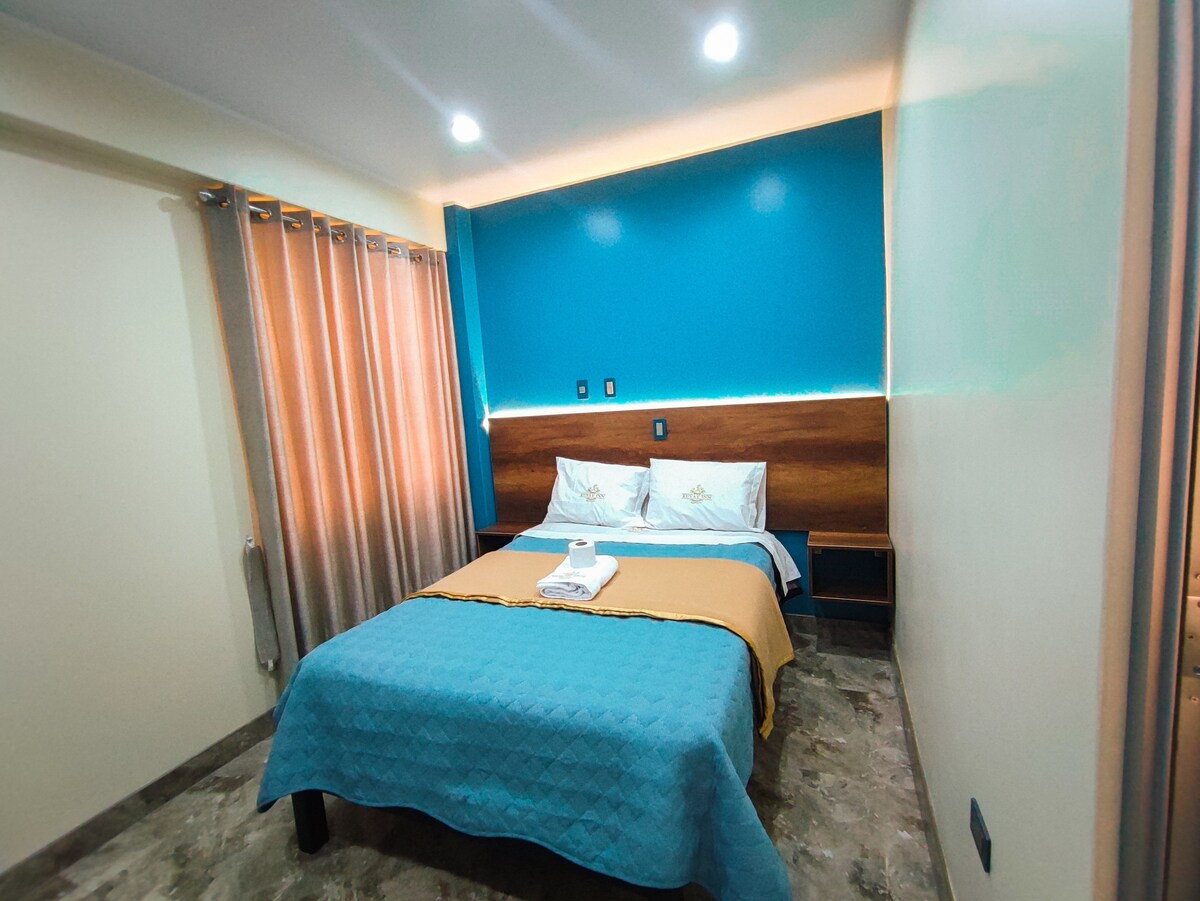 Cozy room on the third floor of the Sueños Hotel in Huancayo, with two beds: a spacious double bed and a queen-size bed, perfect for resting. Fully equipped kitchen to prepare your food, kitchenware at your disposal. Access to Netflix, to enjoy your favorite series and movies and high-speed Wi-Fi. 5 blocks from downtown and 5 minutes from Plaza Vea in El Tambo and Cruz del Sur, facilitating your travel in and out of the city.