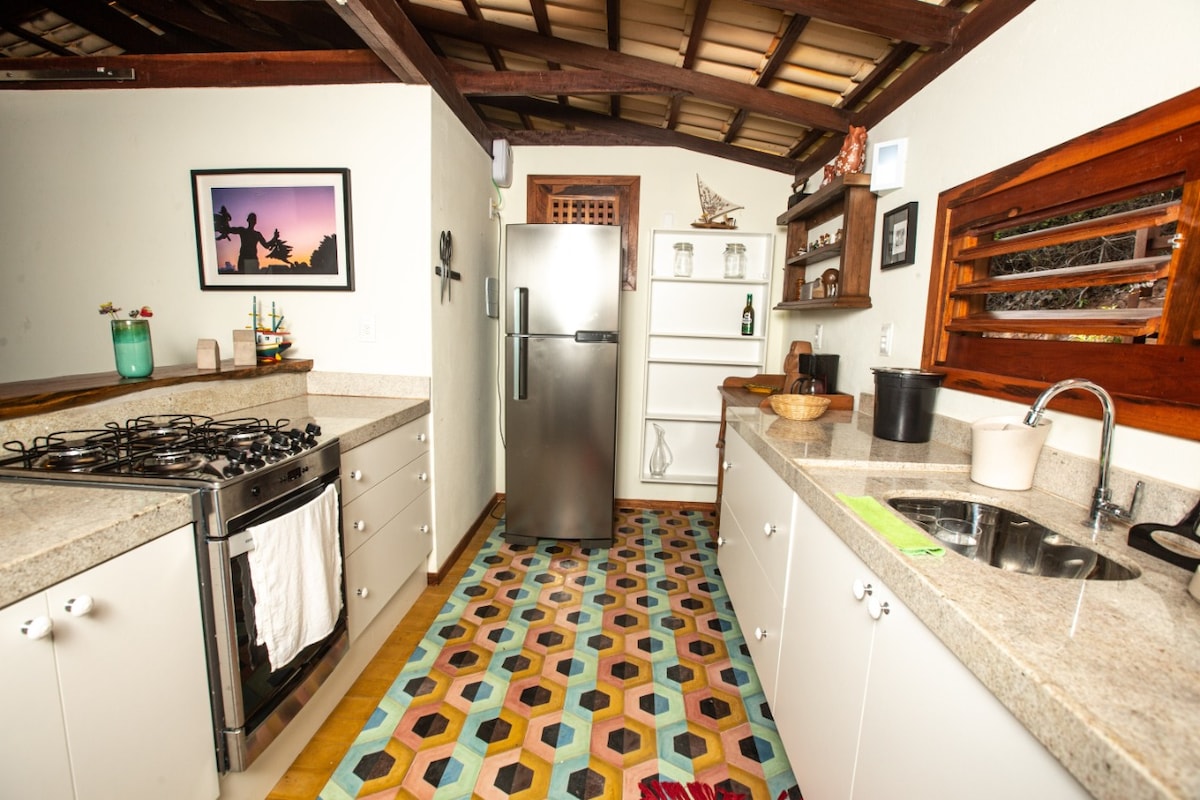 At Casa Sabiá you will relax to the sound of the sea and the singing of birds. Enjoy the incredible sea view. From the kitchen, living room and balcony, the landscape will surprise you. Ideal for families and friends who like to cook or have a barbecue, our kitchen is equipped with everything you need to enjoy these moments. The internet is high-speed, ideal for studying, working and watching a series or movie.