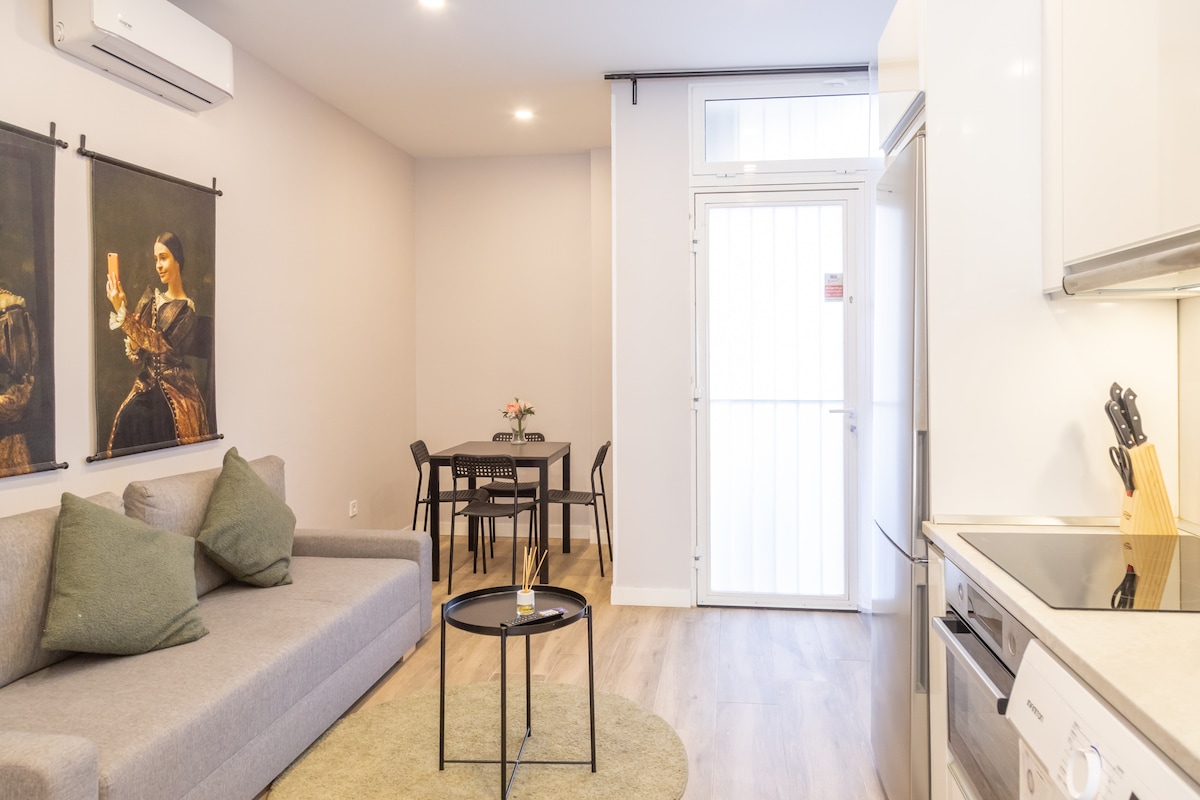 This beautifully designed apartment combines comfort and style, making it ideal for up to 4 guests. The apartment features bedroom, bathroom, a cozy living room with a sofa bed and TV, as well as a fully equipped kitchen and dining table - perfect for a relaxing and comfortable stay. Conveniently located just a short drive from Madrid Airport and only a 5-minute walk from the Planilonio Shopping Mall. It also offers excellent proximity to IFEMA Convention Center and the Metropolitano Stadium.