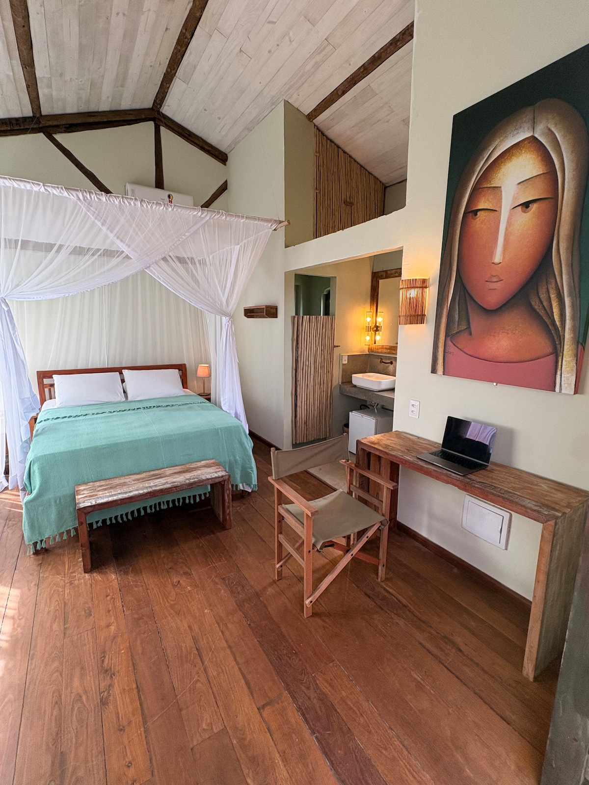 Beautiful and private ensuite bedroom, in the heart of Velha Boipeba. Everything’s been designed with a perfect mix of natural materials to create a space that feels both rustic and modern, offering all the comforts you need for a relaxing stay. With its own staircase and separate access to the ground floor, giving you total privacy and independence, the room features a queen-size bed, en-suite bathroom with walk-in shower, and plenty of space for your toiletries and clothes.