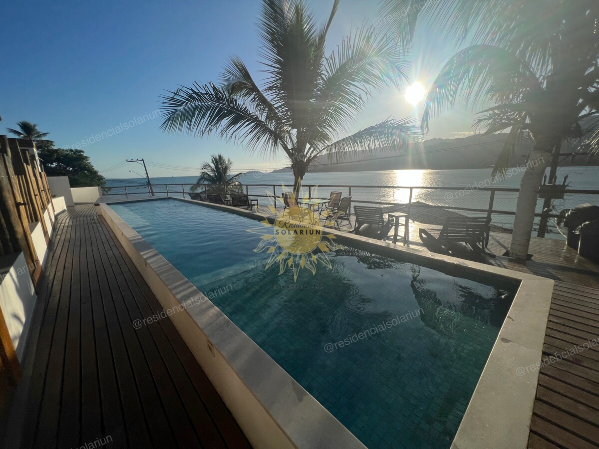Suites for up to 7 people in Ilhabela with a unique sea view in a private condominium. Suites equipped with a compact kitchen, private balcony and private bathroom. Wi-Fi, valet parking and a swimming pool for collective use are available. Pet-friendly and accessible. Beaches and waterfalls. Restaurant, markets and bakery. Our condominium is located between Ilha das Cabras beach and Ilhote beach, a privileged location with a beautiful sea view. Enjoy!