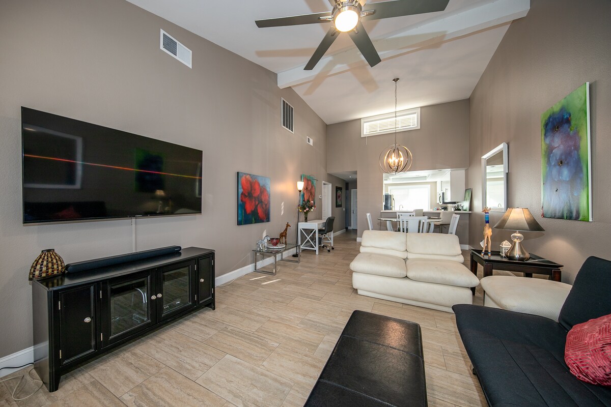 The whole group will enjoy easy access to everything from this centrally located place. A skip and hop away from the Polo grounds and several restaurants on our main highway 111. 3 bedrooms with 3 full bathrooms, no need to fight over who gets to shower first. His and hers sinks in the master bathroom. 70 inch TV in master and living rooms. Alexa devices in each room to play your own music or set up your own alarms.