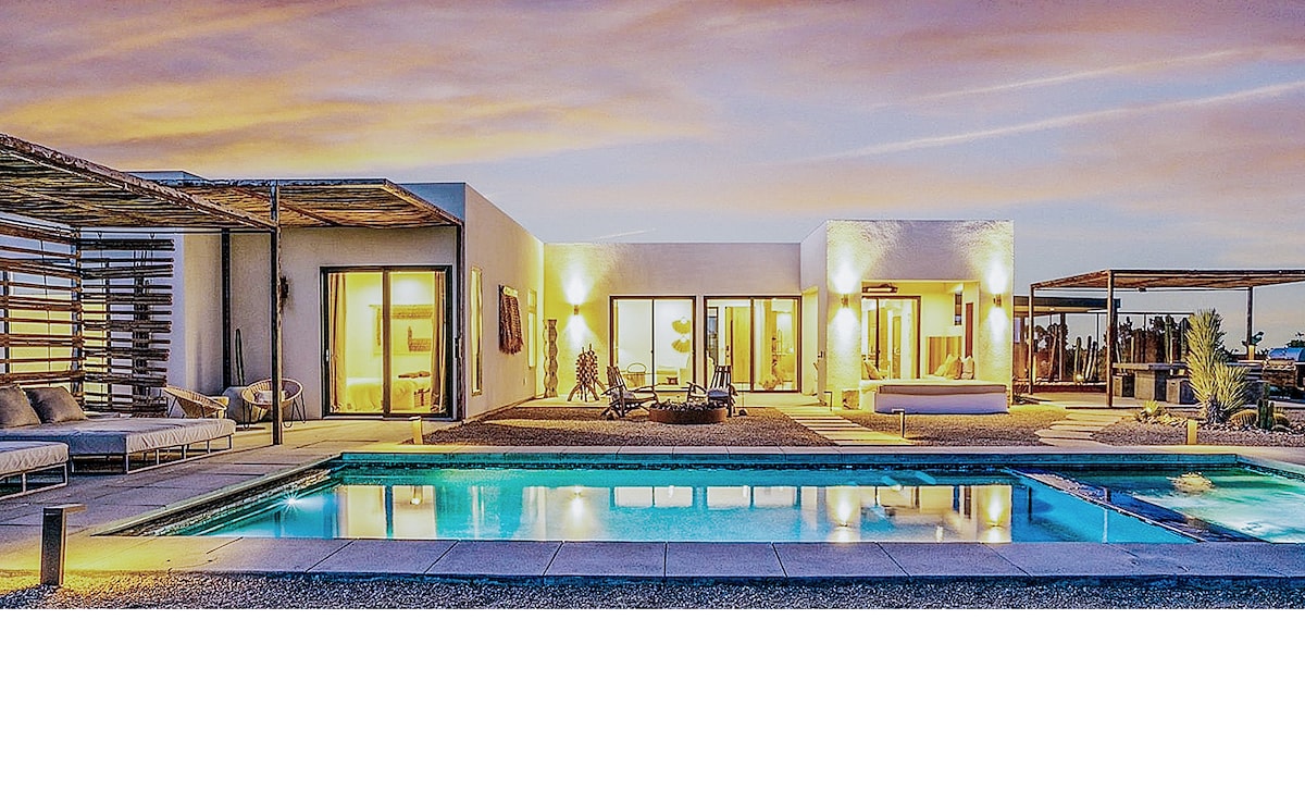 Escape to a secluded 5-acre desert sanctuary where heated pool and spa meet architecture and raw landscape. Designed for privacy and elevated living, 6 miles from Joshua Tree. Private gated estate with sweeping desert views and open desert surroundings in total stillness under vast desert skies. • Pool + spa • Yoga circle + bocce • Fire pit + stargazing • Outdoor dining + pizza oven • Sonos + Tesla charger • Concierge services (chef, massage, sound healings) • Robes + Wonder Valley amenities