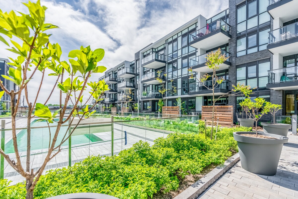 The perfect spa getaway an hour away from Toronto! Modern and bright fully stocked condo with a 2-3 person indoor sauna, fireplace, and an outdoor fire pit. Outside you are surrounded by 200 acres of nature preserve, with trails for walking and biking, golf, kayak, canoe, boat, etc. → Beach access → Underground Parking for 1 vehicle → Fully equipped + stocked kitchen → Coffee & Espresso bar