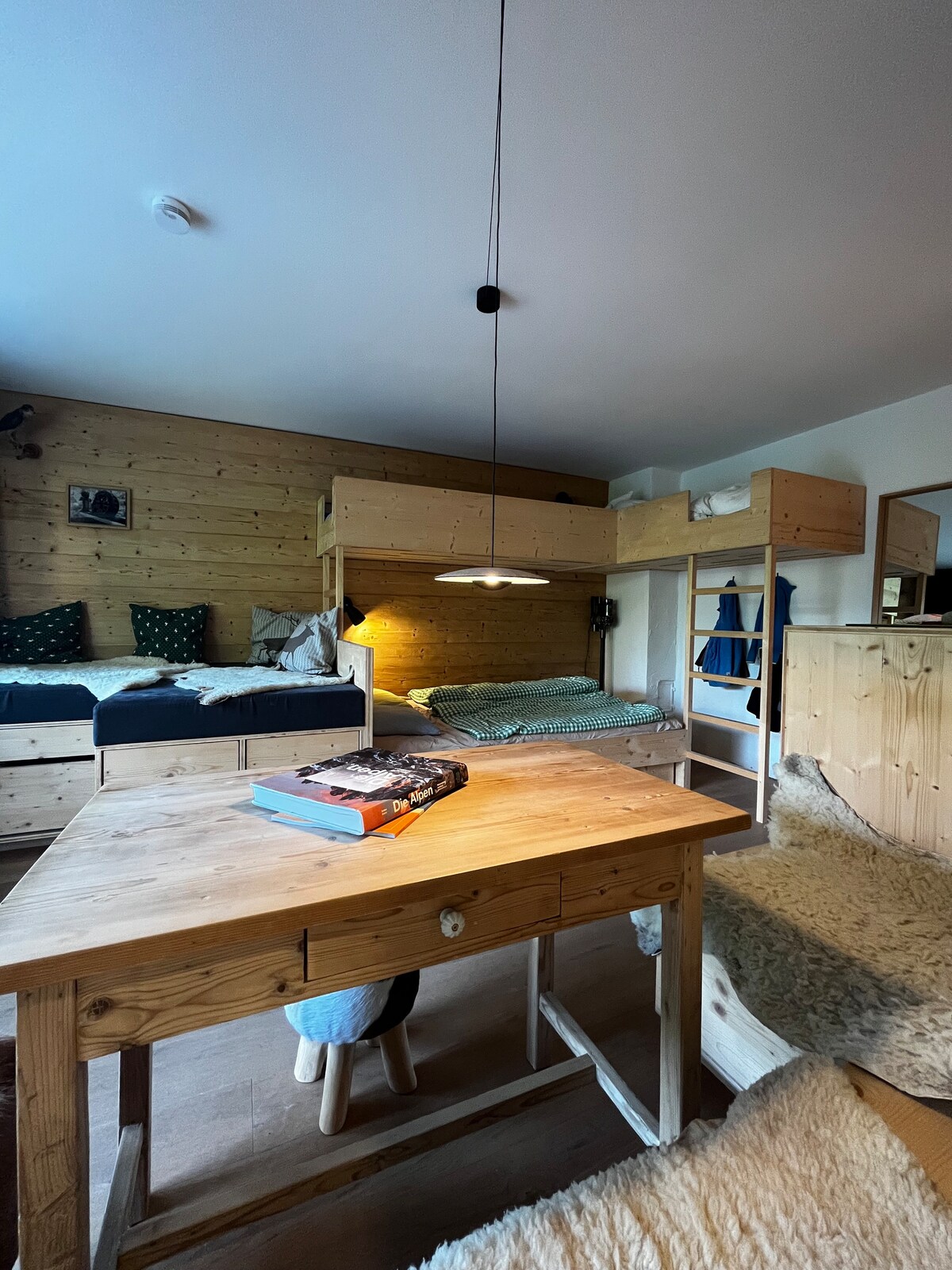 Our apartment is decorated with reclaimed wood, stone, and high-quality materials in the Alpine style. Most of the furniture is beautiful individual pieces. We racked our brains about how to create the greatest possible feeling of well-being. Coming in and feeling good while enjoying the great views of the Predigtstuhl was the goal. In the apartment building there is a large panoramic pool and a measly fitness area.😂 The house has a great location and very good accessibility.