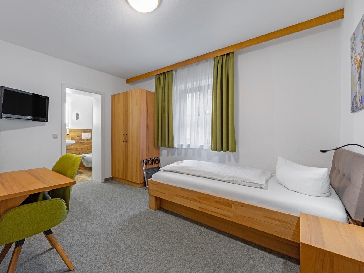 This bright and airy single room extends over 15 square metres and fits one person. The Bavarian-style space includes a comfortable single bed, a modern bathroom with shower, a spacious wardrobe and a window that looks out onto a relaxing nature view. For guests who want to plan out their nature retreat in Unterwössen or do some reading while taking in the mountain views, the room also comes with a desk, a TV and a comfy chair.