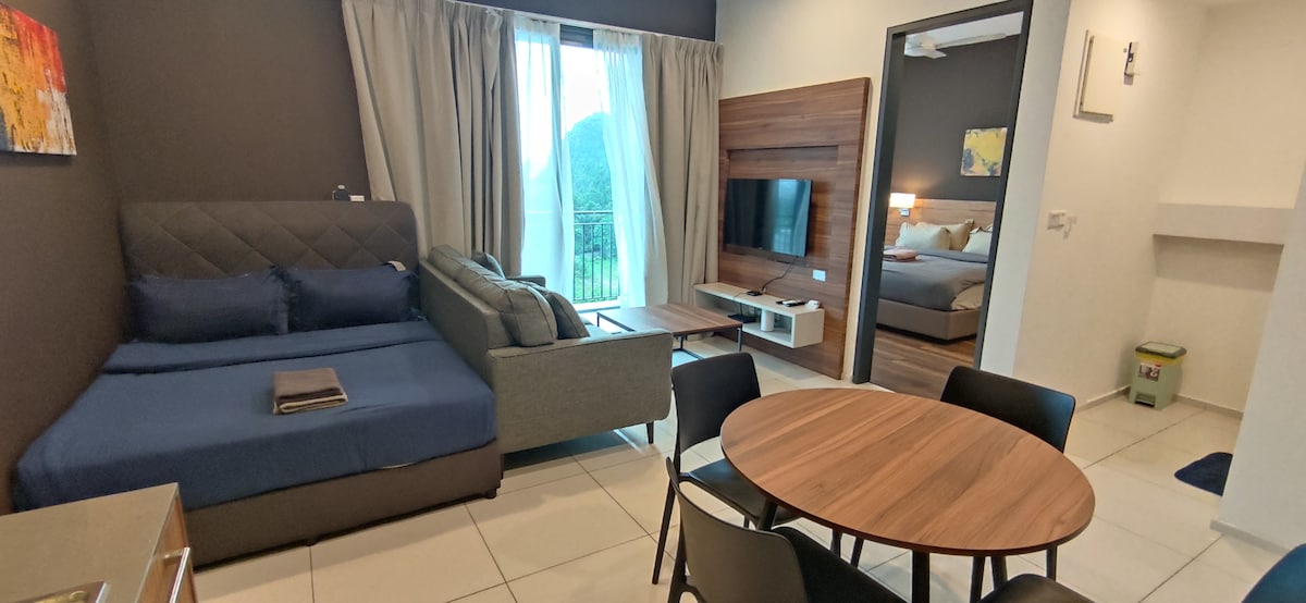 [Welcome to Kaienju@Onsen] Escape to our boho-style condo with Asia's 1st Onsen natural hot spring pool situated in Ipoh. Immerse in stunning mountain views while swimming at the infinity pool. Bring your kids to the Lost World of Tambun water themepark that is just 2 mins walk away for an unforgetable adventure. After a tiring day head back to our cozy place to watch Netflix with your loved ones. Relax, rejuvenate, and unwind. Book now for an unforgettable family gatherings in peak seasons !