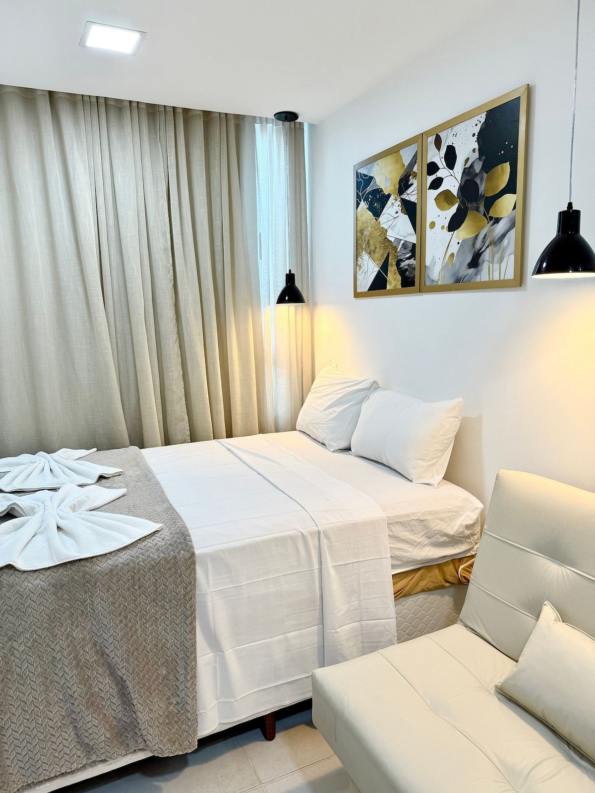 Studio at Marulhos Suites Resort. Queen bed, double bed, extra mattress, air-conditioning, good internet and smart TV. The kitchen has a refrigerator, freezer, coffee maker, sandwich maker and other kitchen utensils. Cozy apartment facing the pools. The hotel is first-rate, featuring multiple swimming pools, a sauna, fitness center, soccer and tennis courts, playground and daily recreation for the kids. I've been renting this and other flats in Muro Alto for a few years, so you can trust me!