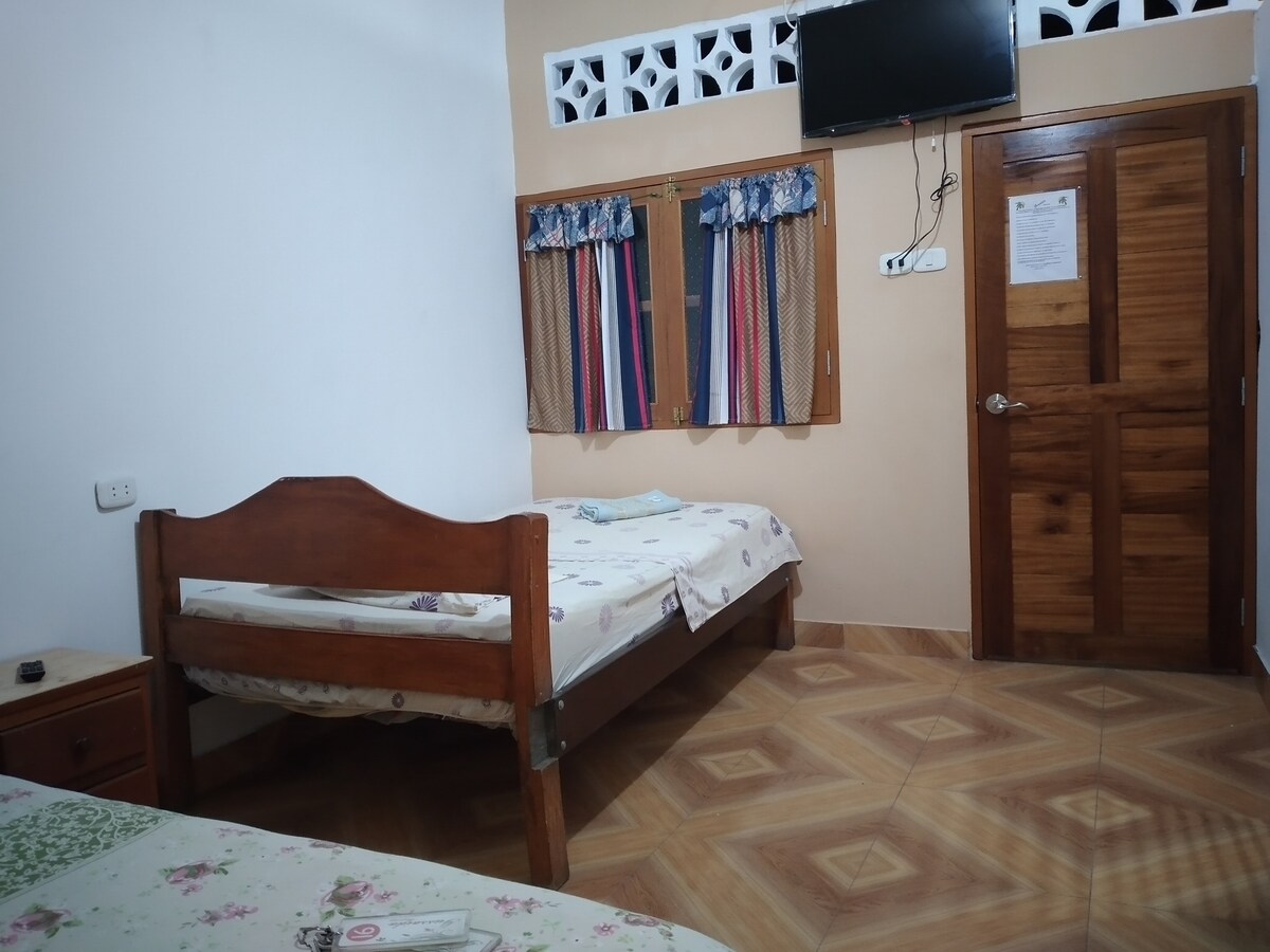 Comfortable 16-square-meter room, with cable TV, fan, single beds and a half, paradise mattresses, with private bathroom with mirror and adequate lighting, wardrobe, chair table, beautiful paintings adorn the room that has a window to a patio with natural plants