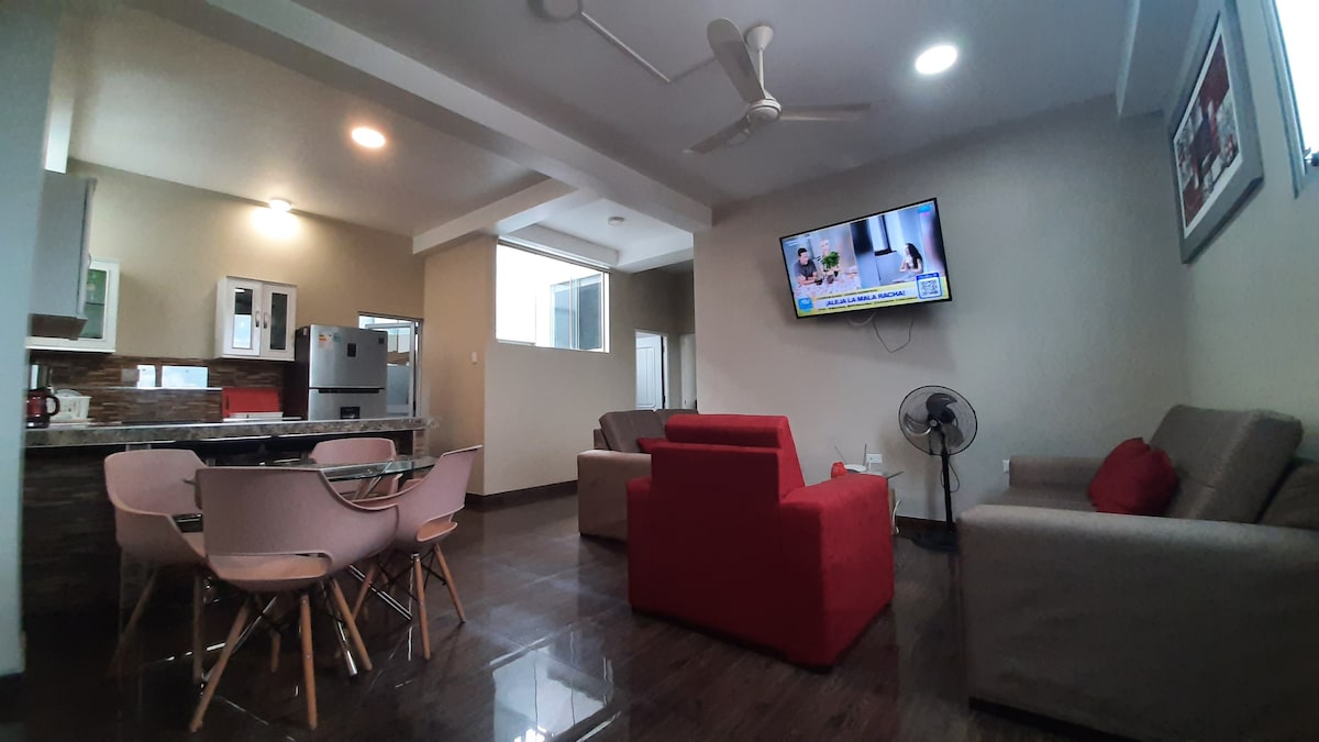 Relax with the whole family in this accommodation where tranquility is breathed. We offer you a living room, dining room, equipped kitchen ideal for preparing your food inside, kitchen room, this area is with a fan, a bedroom with two beds for two people, air conditioning, cable TV, private bathroom with hot shower, balcony overlooking the pool, residential area, quiet just three minutes from downtown.