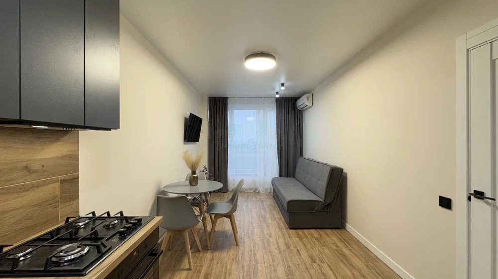 Интерьер квартиры выполнен в легком скандинавском стиле с элементами прованса. На окнах в зоне кухни минимальный декор в виде удобных ролетов, в спальне — шторы из легкого, струящегося материала,которые сдвинуты в сторонку от самого окна, чтобы пропустить как можно больше солнечных лучей. Через дорогу от дома находится большой супермаркет Novus и McDonald's. В 10-ти минутах первый украинский мегамолл — LavinaMall