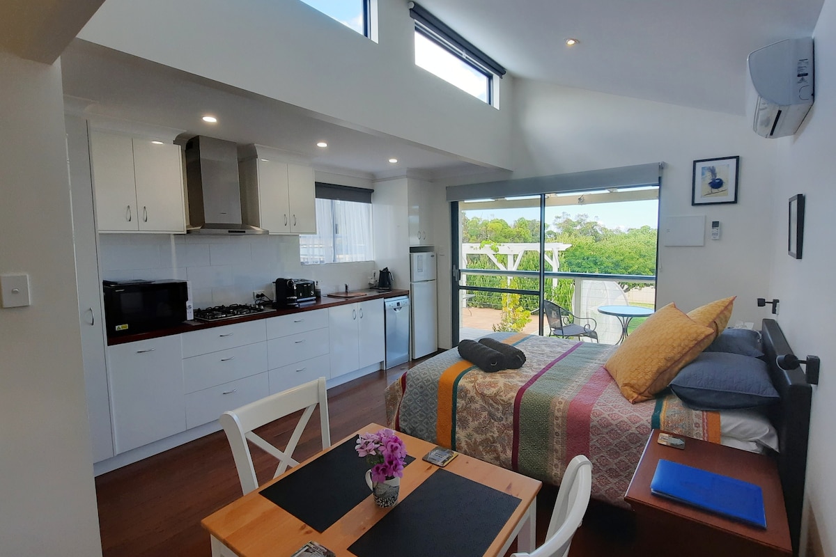 Self-contained 1 bedroom cottage less than 5 minutes walk to town. Stove top, microwave, electric frying pan and slow-cooker provided. Large, covered front veranda overlooks a panorama of trees, pastures and the town, which is very pretty at night. Built at the rear of my home you will have total privacy but I am happy to give you advice on the wonderful things Denmark has to offer.