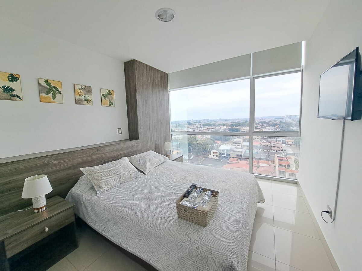 Cozy suite with panoramic views of the Guayas River. It is located in the best residential and commercial area of the city of Guayaquil. 5 minutes from the airport and 3 minutes from the land terminal, you can walk to restaurants, bars and supermarkets, the sector has security cameras, private security, national police and 24-hour concierge in the building and its surroundings. The building has a large social area with a swimming pool, jacuzzi, sauna and gym. VISITORS ARE NOT ALLOWED