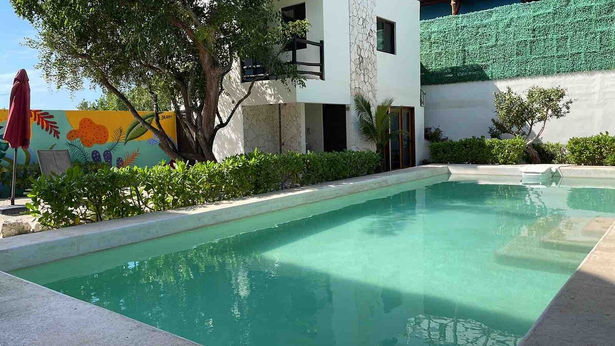 FAMILY apartment of 96m2 It has an equipped kitchen, bar, living room and breakfast room, 2 bedrooms (1 Queen 150x190 cms and 2 single 90x190) terraces and 2 full bathrooms. Mini Splits, TV and Wifi. Located 30 meters from the sea, close to several hotels and beach clubs. The complex has a swimming pool and sunbathing areas, as well as a laundry area (coin washer and dryer) Approximately 10-15 minutes (1km) from downtown Holbox and 800m from Punta Cocos (Bioluminescence)