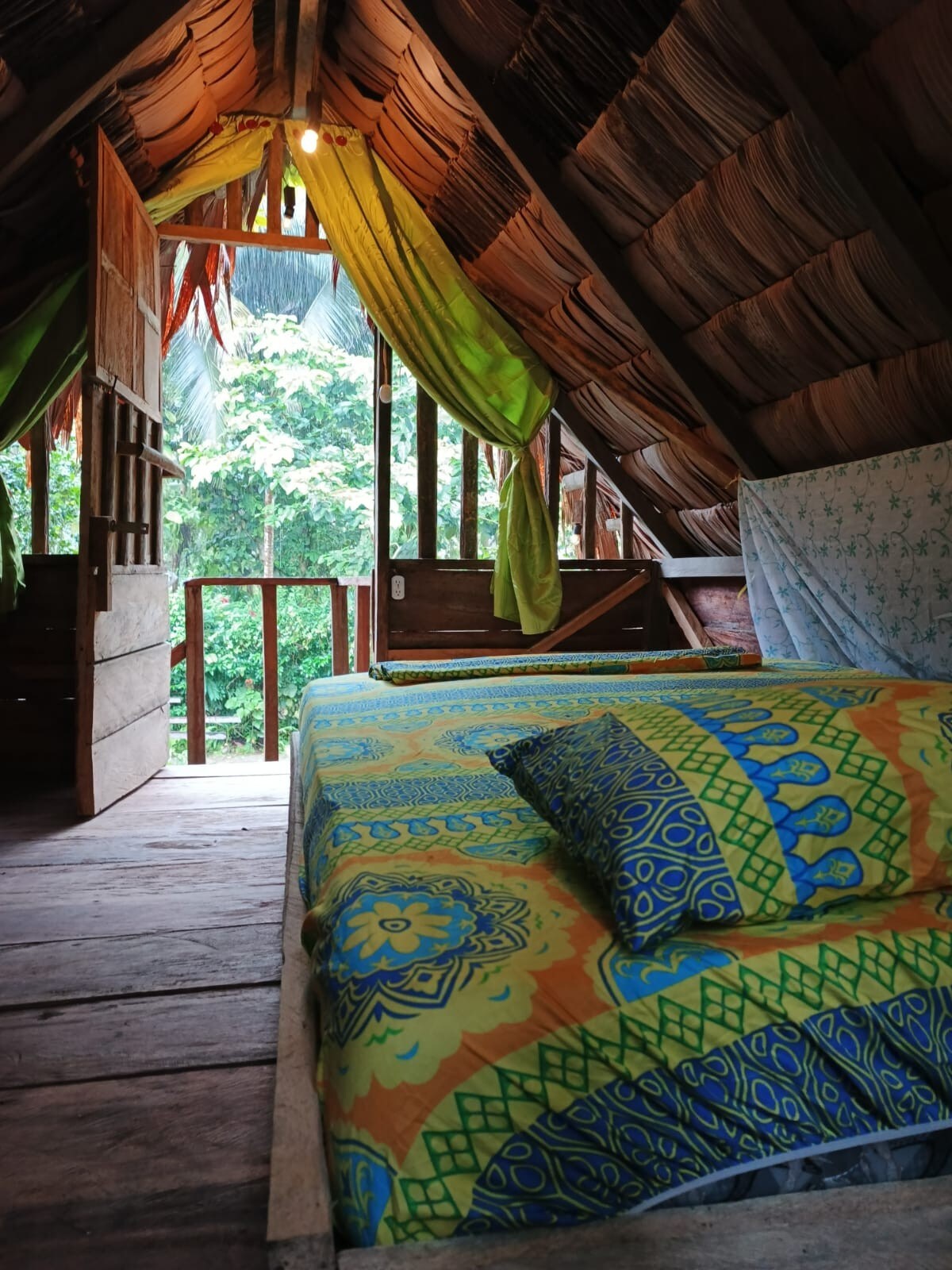 Private cabin ideal for couples. It has its own shower and internal bathroom and a double bed. It has a balcony with a small table and is surrounded by gardens where you can see birds and butterflies. The hostel's space is close to the beach, about a three-minute walk. It is located in a very quiet area of the La Barra community, in front of the hostel is a cocale and behind is the mangrove. It's a perfect place to rest and enjoy nature.