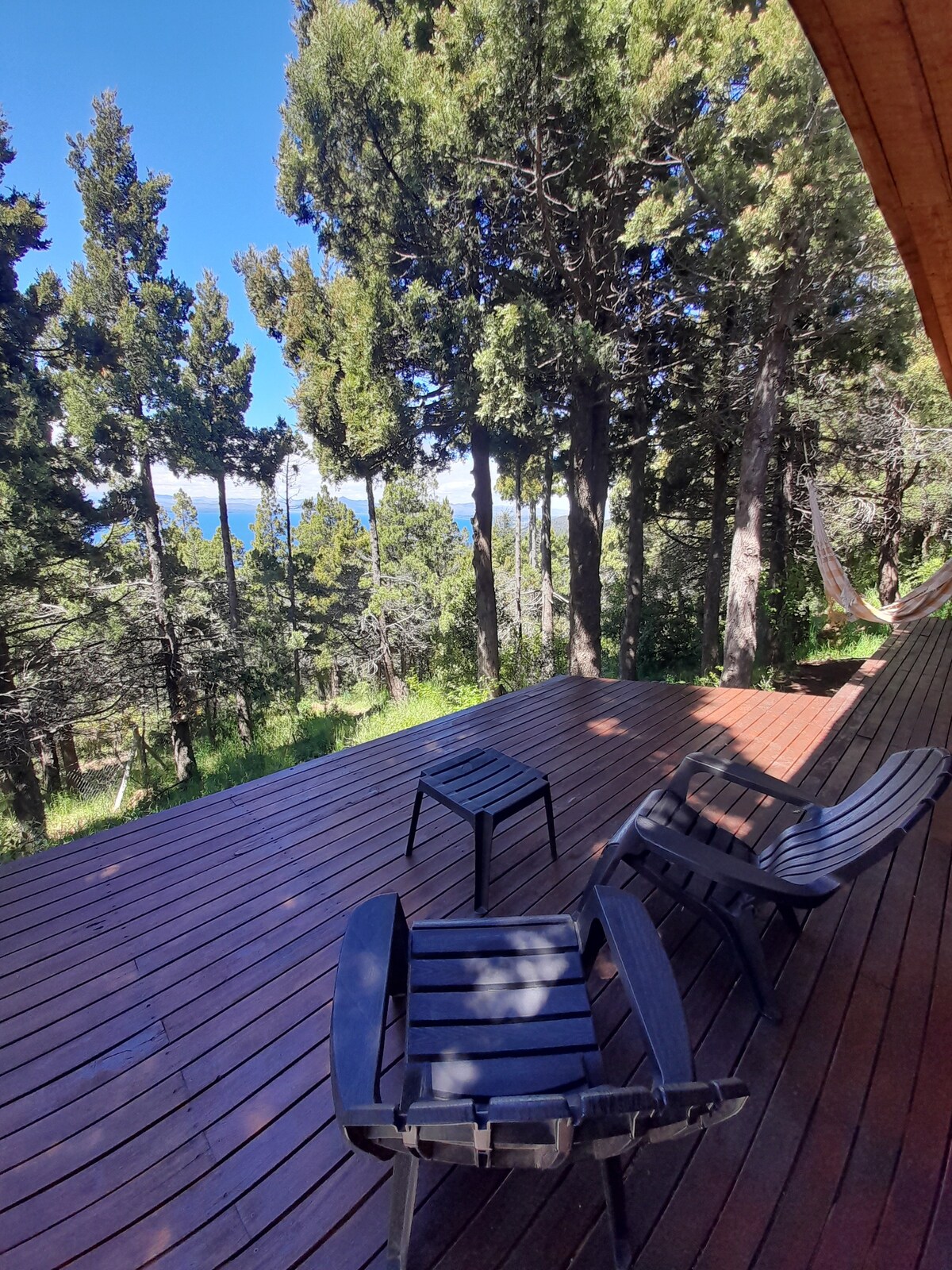 A warm, rustic-style cabin on the shores of Lake Nahuel Huapi with a hot tub, wood-burning fireplace, and deck. A studio created for relaxation and romance with a view of the sunrise and moonrise over the lake. Smart TV and FIBER OPTIC internet with WiFi for working. A kitchenette with everything you need, including a Dolce Gusto coffee maker. A safe to protect your notebooks when going for a walk. Full bathroom. Pool, ping-pong. Beach: Kayak and standup paddle. Continental breakfast.