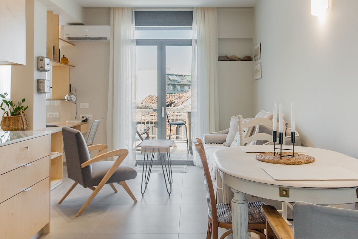 Our guest apartment is absolutely brand new, transformed from an old typography workshop to a sophisticated design space. The furniture was created by hand using local and eco-friendly materials or renovated old pieces. There is a King size bed with super comfortable mattress and premium quality pillows, a work desk with a library, a sofa that turns into a double bed and a fully equipped kitchen with a dining table. The large industrial style windows open directly space to the veranda where our guest could enjoy their lunch or relax to the deck chairs with an unrestricted view to a central soothing square In spacious bathroom, you will find a big shower and a storage space with many extra amenities and comfort facilities like washing machine, hairdryer, first aid kit and toweling. The space has high-speed internet and is designed to be accessible for persons with special needs. Every space or supplies in my property are available to use. I allow a flexible arrival time best for my guests and also I m accessible frequently because of living and working in the neighborhood. But I prefer to respect your privacy so I let you know to contact me (sms, mail, phone) if you have any request or concerns. Also there is available a unique guide with various info’s and many tips for the city in order to facilitate you to self-manage your needs and discover the “genius loci” of the place. The apartment lies in the neighborhood of Psiri, one of the oldest districts of Athens around the rock of Acropolis. It’s on a quiet street next to a pedestrian area, with small squares where people gather to eat or shop from artisans or collectors. Walking distance (3-4 minutes) by metro stations of lines Monastiraki (line 1 & 3) and Thissio (line 1). Monastiraki station has a direct connection to the airport and to the Piraeus Port too. Using metro or by car/taxi arrive at the Larisis Train Station to central and northern Greece. Parking using a low-cost card or at private parking to the next block by a daily fee (starting from 5€) Don’t hesitate to ask information about current cultural and social events around the city during your stay. Also I m a young mom and I can share with other moms many facilities for feeding, sleeping or creative play for newborns and kids.