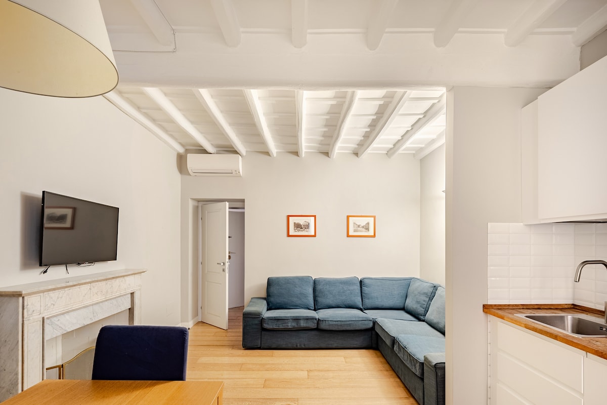 A romantic, bright apartment, where every detail is designed to make guests feel pampered. The living room with open kitchen creates a convivial and harmonious atmosphere, ideal for relaxing. The bedroom offers comfort and tranquility, while the intimate and functional study is perfect for working or reading. The apartment also features a delightful balcony, ideal for enjoying breakfast in the morning or a romantic aperitif at sunset.