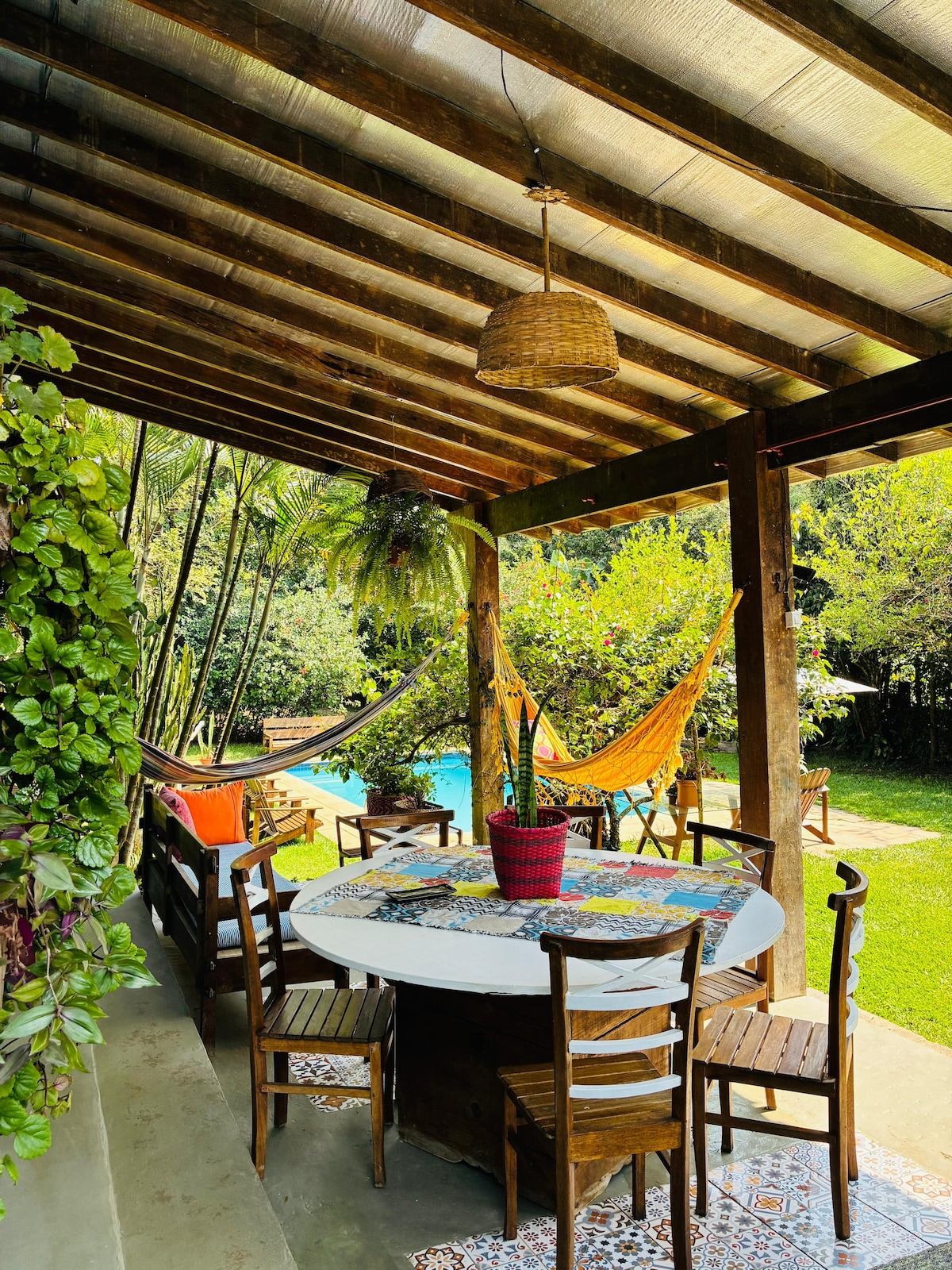 Take it easy at this unique and tranquil getaway. Well-lit chalet with a panoramic view of the woods. Lake inside the property. The kitchen is well equipped. Blackout curtains and air-conditioning. It is possible to work from home with good Wi-Fi. Guests can stretch out on the hammock by the lake or even take a boat ride. We have a shared swimming pool. Ideal for those who need to escape the city and relax. See more on IG @chale_nolago Ps: We have a total of 2 Airbnb spaces on the property. Shared outdoor spaces
