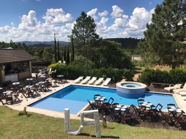 1000 meters from the center of Cabreúva, this beautiful chalet for at least 15 people is a true oasis. With living room and kitchen, 2 bathrooms and two balconies. Here you can celebrate your party or event in style, or come and enjoy our space with 250,000 meters of nature with friends and family. Adult and children's pool, floor fireplace, playground, game room, trails, stream and lake. In addition to our restaurant and olive oil shop.