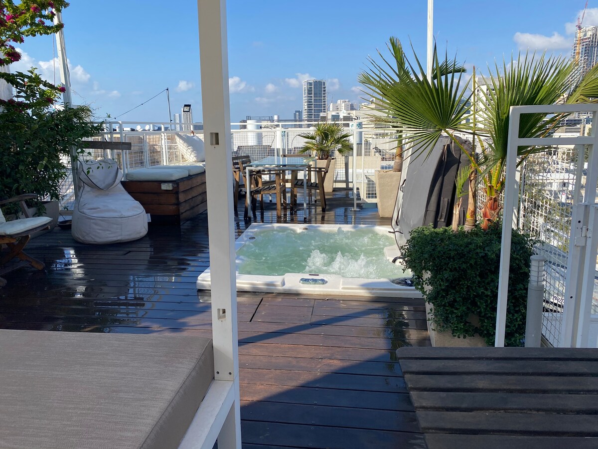 An amazing luxurious triplex. Fine design, located in a quite street on a perfect location - just a minute from Rothchild avenue and 5 min walk from Habima square. This apartment has a first floor with 3 bedrooms and 2 bathrooms, second floor with open spacious kitchen and living room, and a huge balcony terrace, and on the third floor - an amazing rooftop with 360 scenic and a hot tub. It fits perfectly for up to 3 couples or a large family, plus got 2 parking spaces.