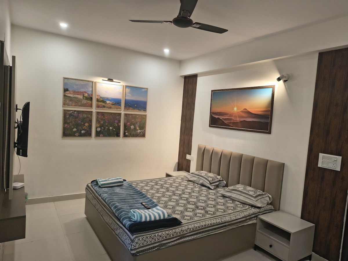 Enjoy a comfortable and stylish stay in this modern, spacious 1BHK luxury apartment, thoughtfully designed to accommodate up to 4 guests. A comfortable king-size bed, while the living area includes a king-size sofa cum bed, making it ideal for families, couples, or small groups. The apartment offers two premium bathrooms, ensuring convenience and privacy. A fully equipped kitchen allows you to cook with ease and step outside to the peaceful outdoor sitting area, perfect for morning tea .