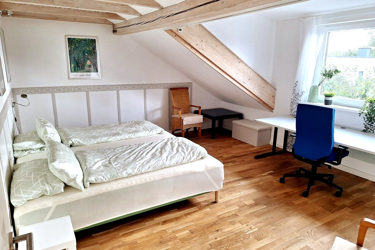 Take it easy at this unique and tranquil getaway. The attic apartment on the 3rd floor offers 2 bedrooms, 1 living & dining room, kitchen and bathroom. The house is a new building and accordingly the interior is in bright and friendly colors. The apartment is in a quiet location and has a beautiful view of the countryside, where you can relax from everyday life. Amenities: underfloor heating, complete kitchen including dishes, etc., walk-in shower, floor-to-ceiling windows in the living room, kitchen and dining area.