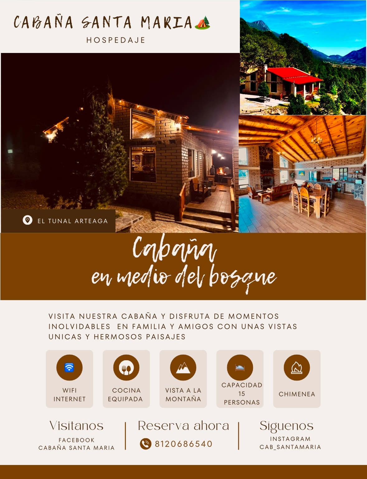 Enjoy a private cabin surrounded by pine trees on a very large and safe plot in Arteaga, Coahuila. With capacity for 12 people, 3 bedrooms, barbecue, sky, fireplace and a corral with 4 calves, it is ideal for families or groups looking for tranquility and contact with nature. Easy access all year round. We invite you to visit us. 🙂