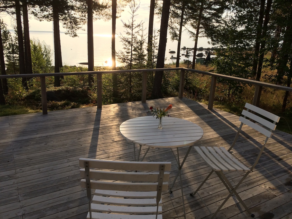 Easy access by bus: Wake up to a breathtaking view on a lake! Right by the water with a wonderful view on arctic nature's magic. 5 mins from Luleå by car, 15 min by bus. Parking by house. Classic Scandinavian interior with white birch walls and high spacious ceilings. Bedroom furnished like studio with kitchen. Piano. Fully tiled bathroom with a luxurious sauna. The perfect getaway: stay in bed all day, check out Luleå, or relax in nature. Ski/skate/bike/kayak rental. Wifi 500/500.