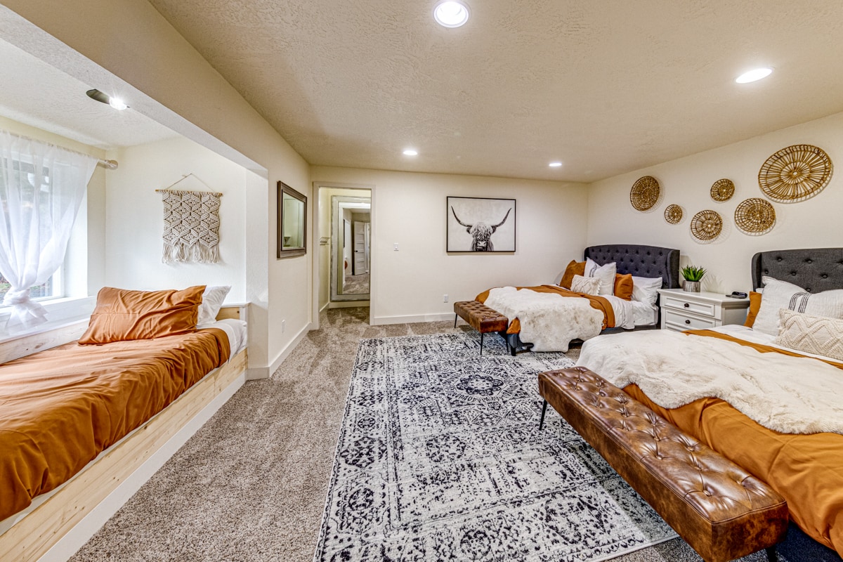 Bring the whole family! Complete with a kids room, sunroom, guest room and master suite. Multiple sitting areas for larger families to enjoy. The private backyard with hot tub, and side yard complete with terraced grass and fire pit make it easy to enjoy the outdoors. Pets under 20 lbs welcome($75 fee), many additional necessities available for those with small children. Large dining area. 1 King, 1 Queen, 1 bunk(full/twin), 1 daybed w trundle(2 Twins) 1 crib. Peloton Bike. Parking: 4 spots