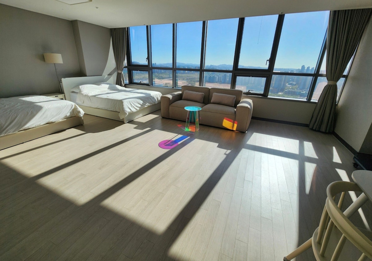"Disposable items are prohibited from Friday, March 29, 2024." 1 queen bed, 1 super single bed, 3 chairs, 3 sets of tableware [Couple/Triple] Cozy 2-beds and 3/4 bath (1 Queen bed, 1 Super single bed) The Incheon Bridge view -Connect to Subway stn. “This is a building where self-isolation is not possible.” * Government Authorized * - Super Safe Guest house ▣Free: Wi-Fi, Youtube, parking in the building ▣Soap, Nespresso capsule coffee machine, bottled water, blackout curtain, shampoo, conditioner, body wash ▣Refrigerator, drom, coffee pot, hair dryer, fan, cleaning utensils Moonlight Festival ▣Park Station: 5 minutes on foot ▣Restaurants, cafes, convenience stores, etc. ▣Cooling & Heating Guide October 13, 2025 Cooling Ends/October 27 Heating Begins Walk ▣in Moonlight Festival Park Opening ▣the pool (scheduled for June): Discount for guests