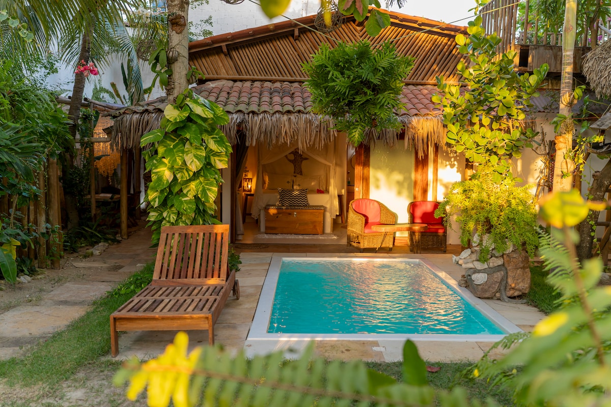 A 2-minute walk from the most beautiful beach in Jericoacoara, on Malhada Beach. A privileged and reserved place. With a wide view and very close to the center. The space is quiet, cozy and high-spirited, with a pleasant outdoor area surrounded by a large and leafy garden with many native plants and trees. It has a terrace/viewpoint with a 360° view of the National Park, also overlooking the sea and dunes. Perfect for nature lovers