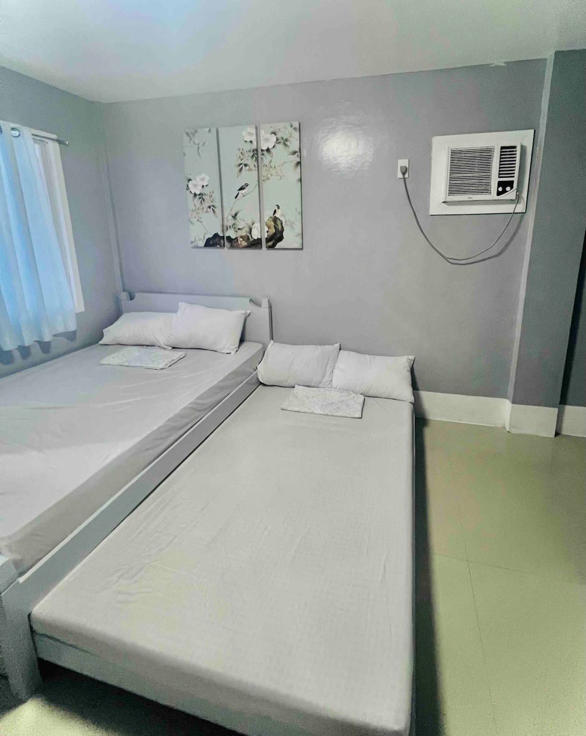A spacious room with brand new split type air conditioning, king-sized bed, mini fridge, and en-suite bathroom with powerful hot shower. There's a 55 inch TV with netflix for those occasional rainy times, as well as high speed fiber WiFi for all your working and browsing needs. The beautiful gardened property is nestled just 80m off the main road. Its the perfect location to get a good nights rest, but you are still within 3-5 minutes walking distance of Panagsama beach, bars and restaurants.