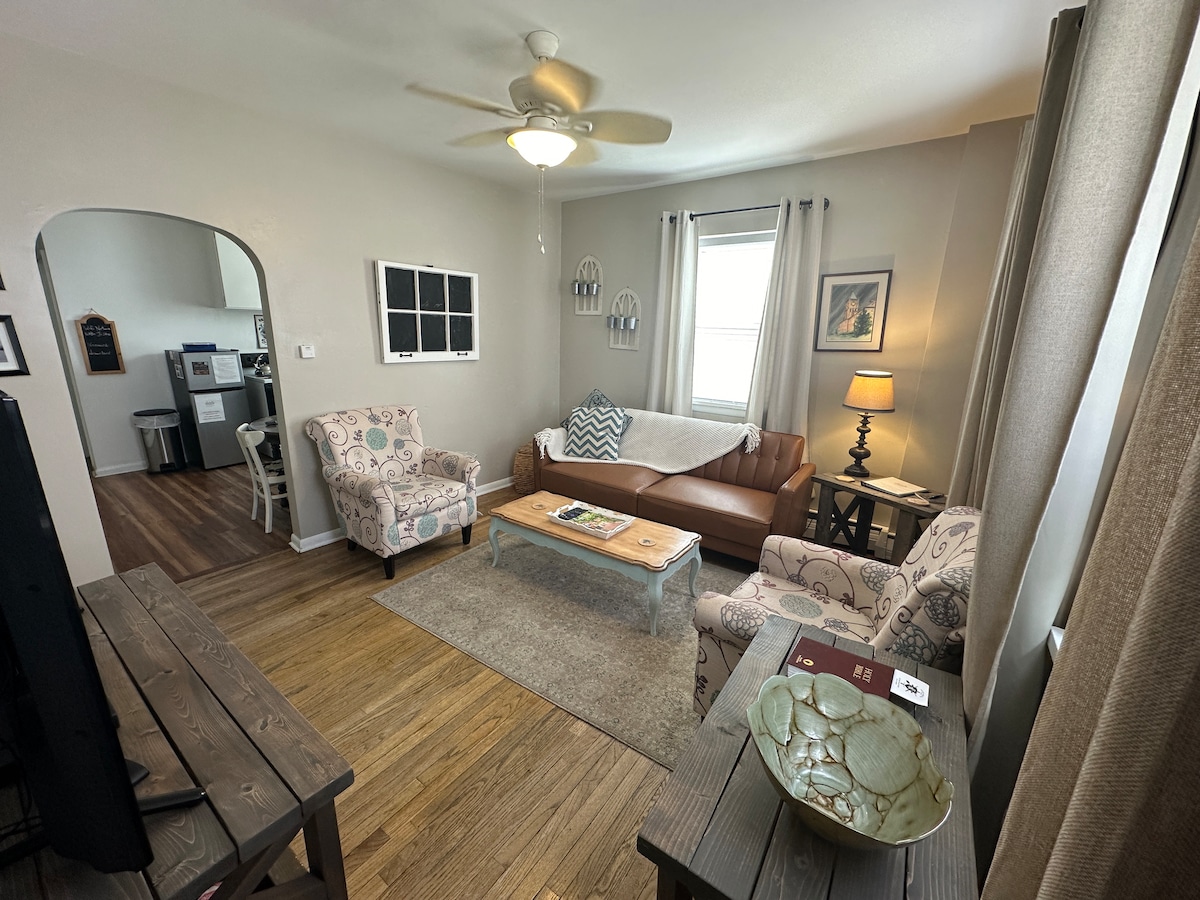 Newly remodeled downtown apartment right in the middle of town. New furnishings, office nook with desk, full size kitchen and appliances, smart tv, free wifi, large open living space with private bedroom and bath. Very clean. Adjacent shared deck with table and chairs is available for use. This is a second floor apartment in the back of Simply Elegant Boutique so there are 17 steps to get to it from the outside. *Rest easy, every surface and door knob is disinfected after each stay.