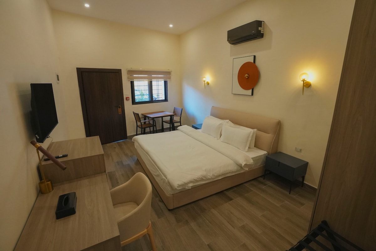 Superior Room – Comfortable & Stylish for Solo Travelers or Couples Perfect for a solo guest or a couple, our Superior Room is fully equipped to meet our highest standards. It features a comfortable queen-size bed with soft, high-quality linens, a work desk, and a flat-screen TV. The bathroom is elegantly finished with black marble and includes a full set of premium toiletries.