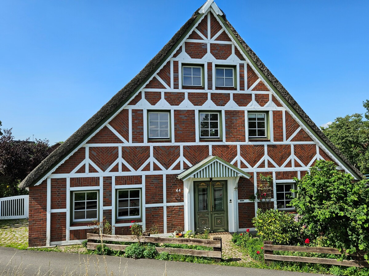 Enjoy the special flair of a 200-year-old, thatched farmhouse, one of the most beautiful half-timbered houses in the village. You are welcomed by a former stable, now a hall-like hall with a special atmosphere: Here you will find the small, stylish apartment, nestled in a beautiful natural ensemble. This house became famous in 1976 when the famous actress Elisabeth Flickenschildt wanted to realize her dream as a farmer in the countryside here, but died in 1977.