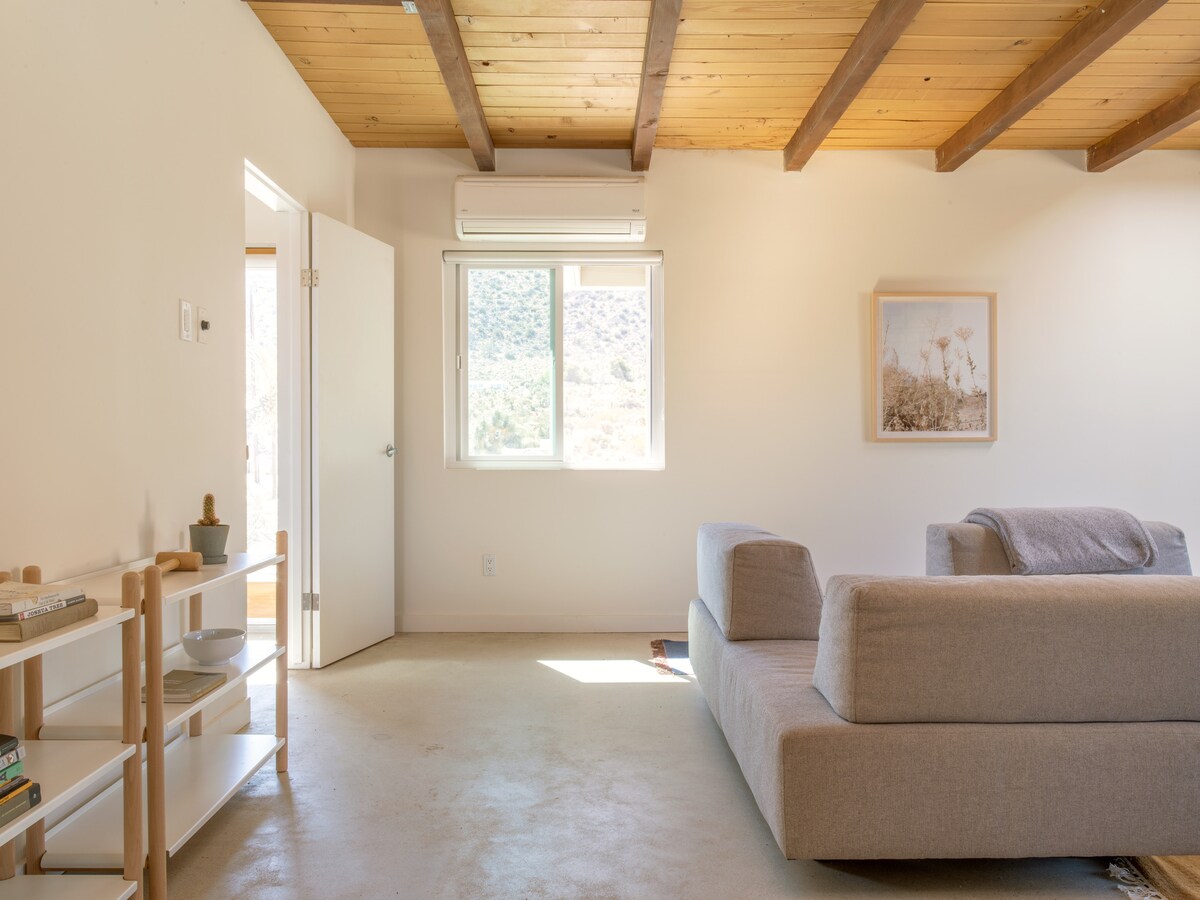 A private high-desert sanctuary designed for deep rest, reconnection, and slow mornings beneath wide open Joshua Tree skies. Soak in the cedar hot tub under the stars, plunge cold at sunrise, and unwind by the fire as the desert goes quiet around you. Thoughtfully designed with bespoke decor, linen sheets, handcrafted ceramics, curated sound, and fast Wi-Fi. Quiet, peaceful, and intentionally crafted for a rare, restorative desert escape. Reconnect with nature, with yourself, or someone you love