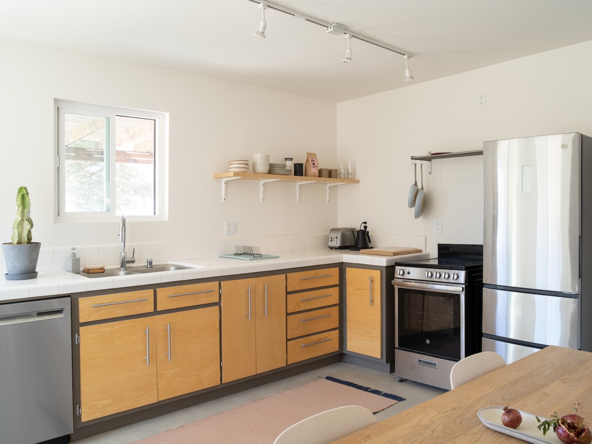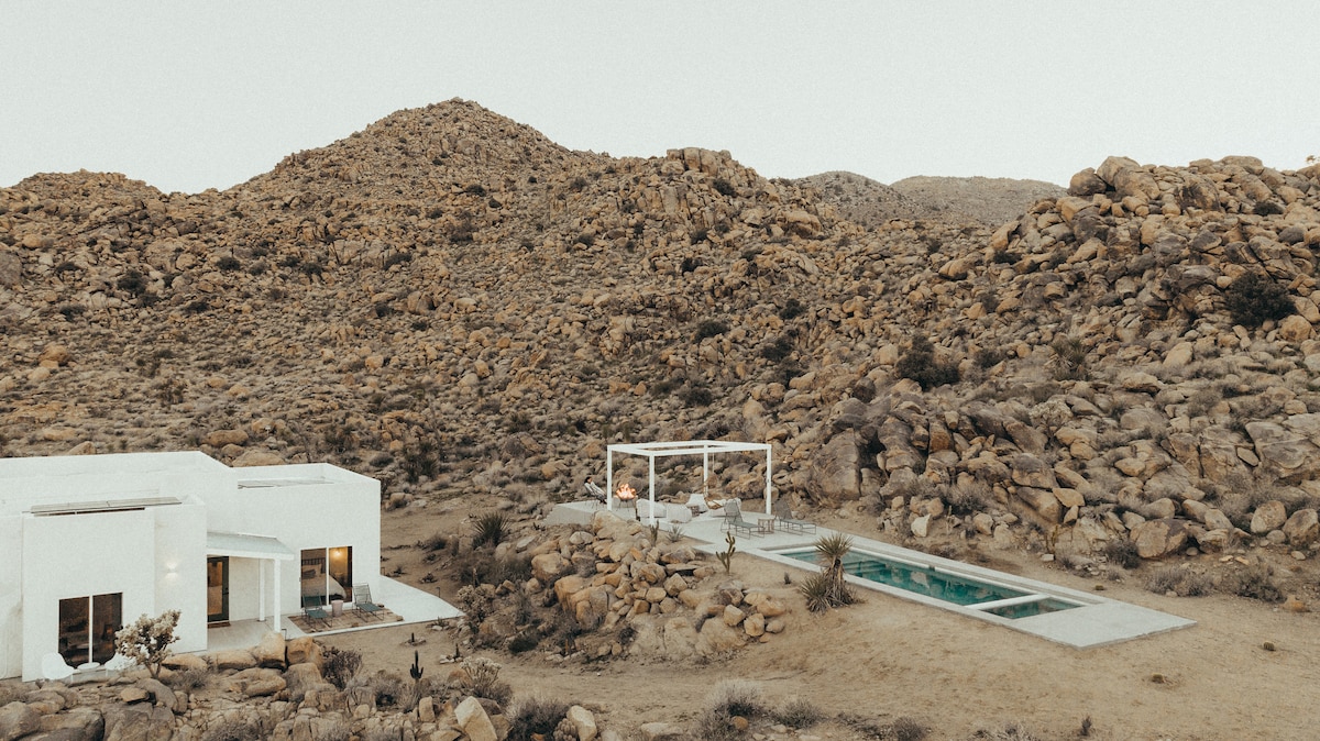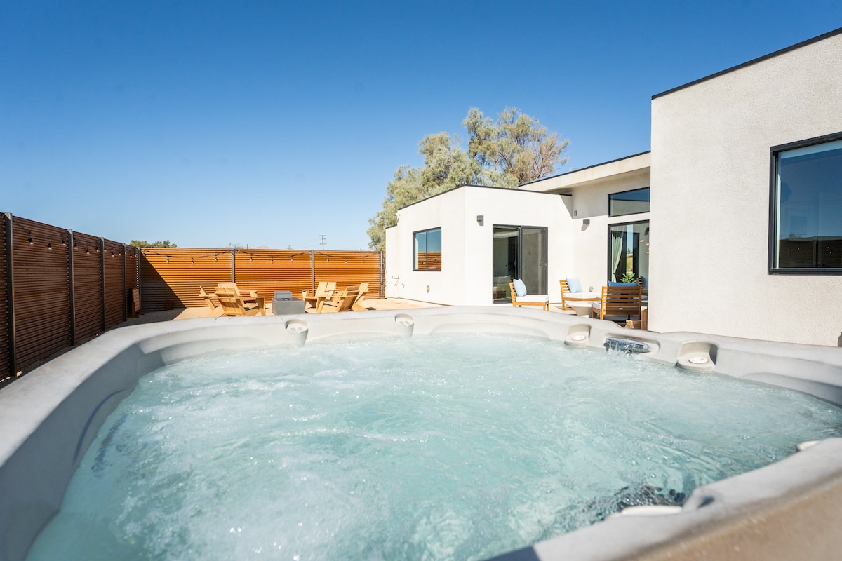 Welcome to the spacious, sun-filled oasis with 360-views of mountain+desert vistas - >2000 sqft of living space - 10 mins from West entrance of JT national Park -5 minutes to JT Village shops+cafes. -Brand new construction -Custom firepit under the stars -Starlink 🛰 200mbps -Fully stocked chief's Kitchen -Coffee Bar and Cocktail supplies -Dedicated Yoga+Meditation room -Oversized Spa- heated year around -Tesla EV level 2 charger -Record Player We invite you to unplug and reset @CasaSerranoJTree