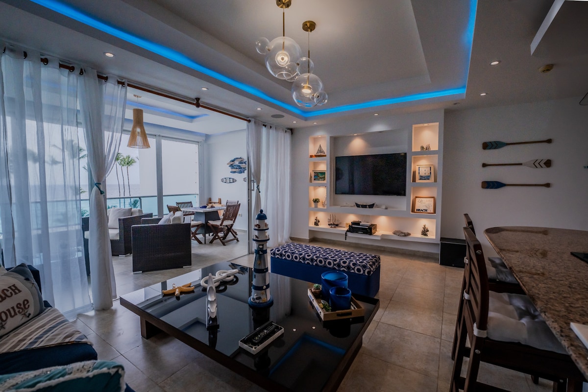 Espacioso, cuidadosamente decorado y muy iluminado, como una burbuja flotando en el inmenso Mar Caribe brindandote una sension de paz y relajacion en todos los detalles y colores que se coomplementa por todas las comodidades que lo componen. Tiene una vista panoramica de 180 grados de Juan Dolio y sus espectaculares atardeceres de colores brillantes que son un espectaculo para disfrutar en familia y amigos, con la arena en tus pies o las brisas caribeñas en las alturas del piso 19.