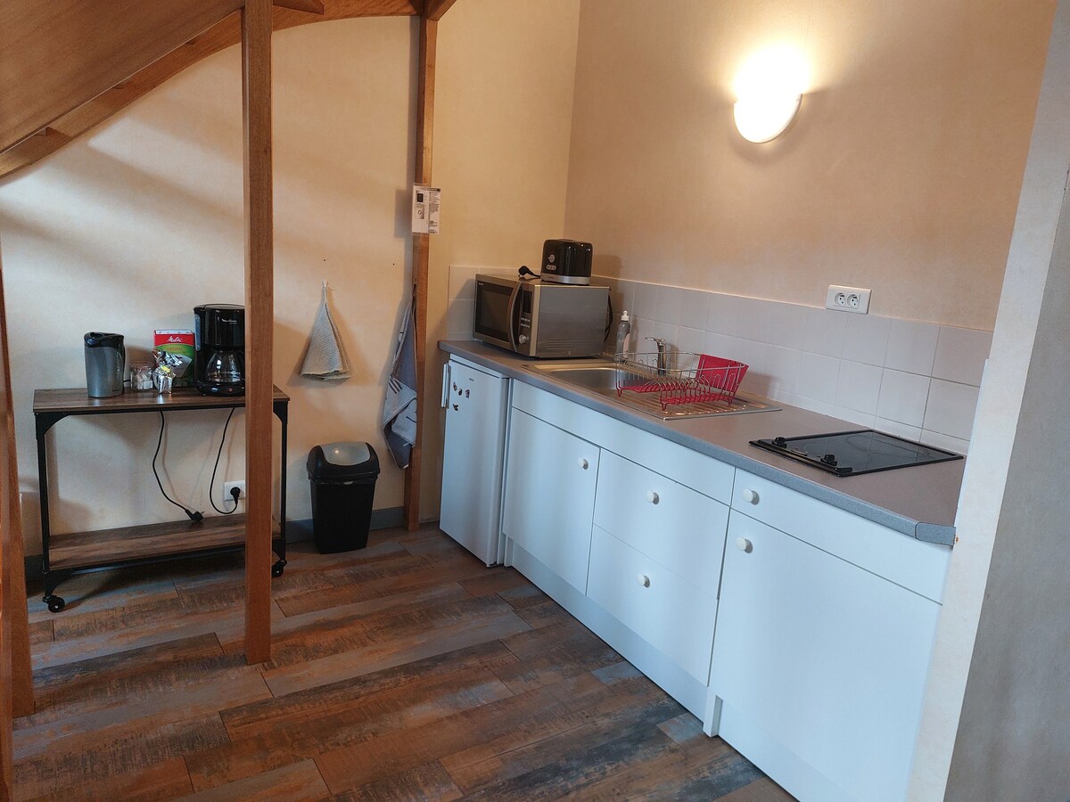 Come and enjoy this small, quiet and refurbished home located close to the Abbey of Saint Pierre de Solesmes. Accommodation located upstairs, access by an external staircase, equipped kitchenette with fridge and electric stove, oven and microwave, coffee maker, kettle, bathroom with double sink and shower, living room and bedroom with 1 bed for 2 people, desk, storage.