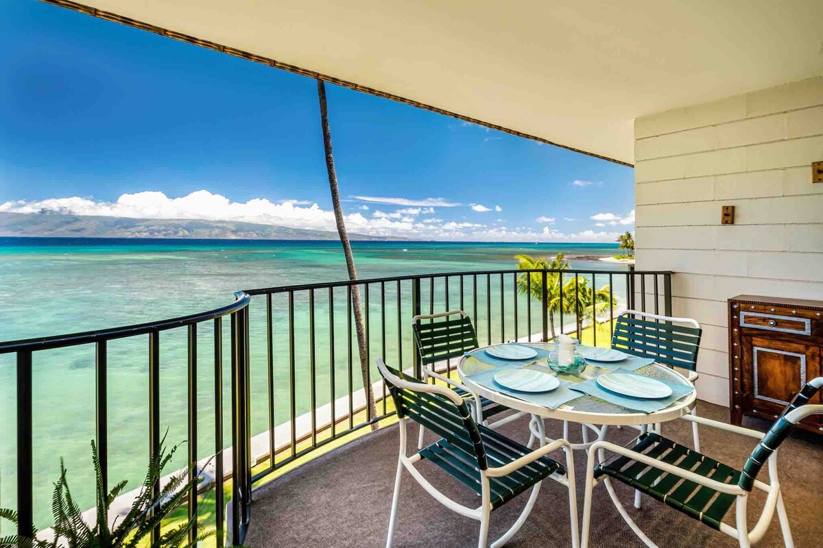 *Available for booking! Thankfully, our condo is not located in the wildfire affected area* Enjoy breathtaking panoramic views in this remodeled oceanfront corner condo located on Kahana Beach! With floor-to-ceiling windows in both the living and bedroom, gentle breezes and sunsets can be enjoyed lounging on the couch or relaxing in bed. Imagine falling asleep to the lull of ocean waves at your feet and waking to spouting whales in the background. Truly an oasis on the Valley Isle.