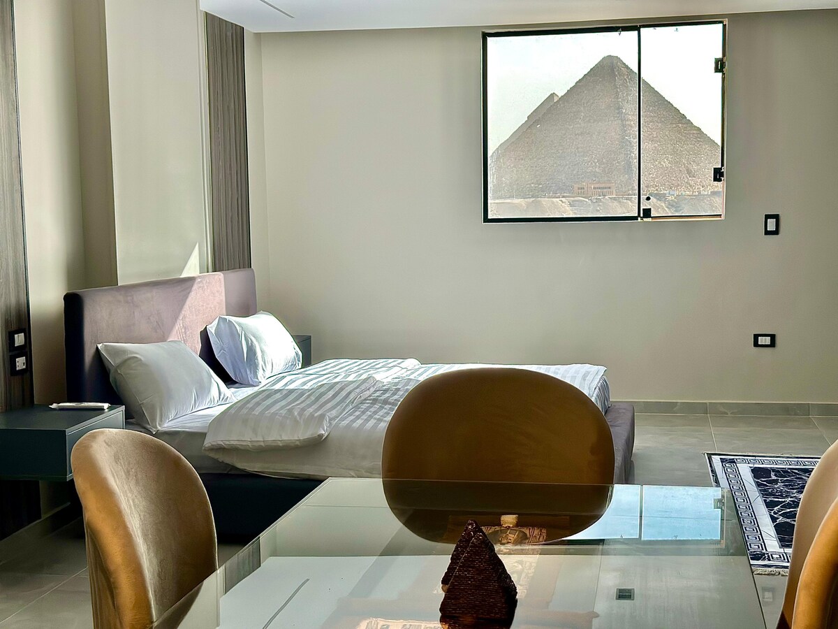Relax in a private Bathtub while enjoying a stunning view of the Great Pyramids through your window. This stylish studio is perfect for couples or solo travelers, offering comfort, privacy, and a peaceful atmosphere. With a cozy bed, modern bathroom, and unforgettable view, it’s a unique escape just minutes from the Pyramids. Experience Giza like never before — with luxury and a touch of history.