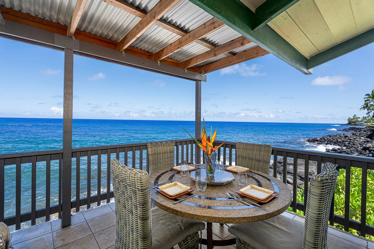 Serenity in Kona- with epic ocean views! Wake up with the ocean waves crashing below. Hang out on the lanai with some Kona coffee from the Green Flash cafe next door. You have a front row seat for whale watching during whale season. Or, hang out and enjoy the sunsets- at times with our local manta ray! We have a queen sofa bed, and AC. Close to town- an 18 minute walk. Quiet, very little road noise here. You can rent bikes too across the street.