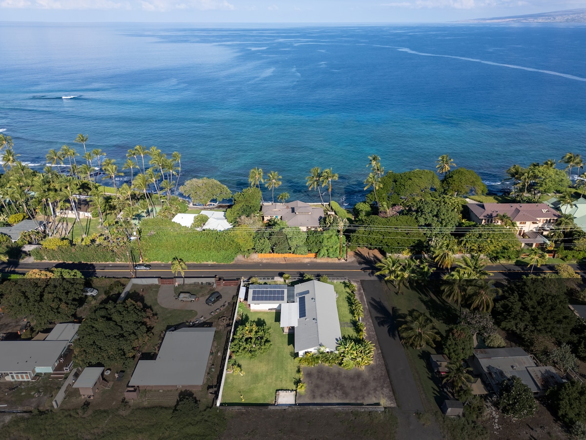 Enjoy panoramic ocean views from every room in our spacious tri-level home near secluded Pebble Beach. Located south of Kona in Kona Paradise, this 4-bedroom retreat features an open floor plan with kitchen, dining, and living areas on the main level. Three large lanais offer stunning sunset views. Upstairs, the primary suites provide privacy and relaxation with an expansive lanai, cozy seating, and a hammock perfect for napping to the sound of waves or watching sunsets in the island breeze.