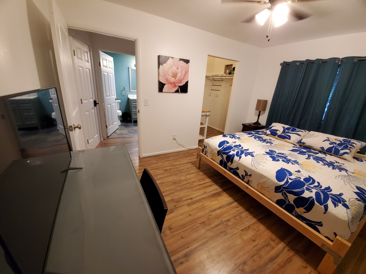 Hibiscus at Kailana Cottage The Kailana Cottage includes two separate rental units that share a hallway. Both units are freshly remodeled, clean, and thoughtfully designed. Hibiscus is set up like a spacious hotel-style room, featuring a king-size bed, large bright bathroom, TV, desk, and a tea/coffee station with mini fridge and microwave. Please note: This unit does not include a full kitchen. Conveniently located near the airport with automated check-in, flexible booking, and free parking.
