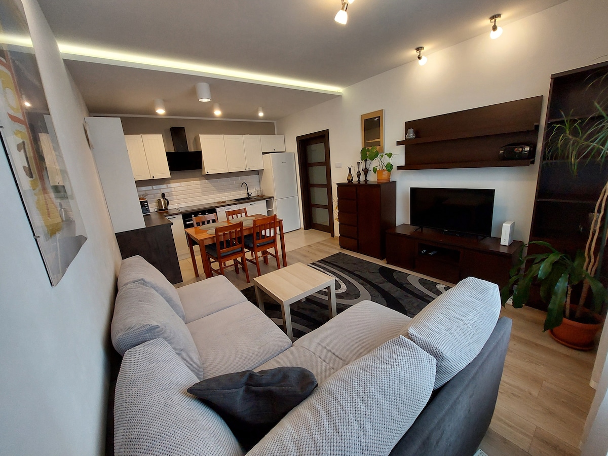 Modern and spacious apartment located on the 2nd floor in a block with an elevator in a fenced estate. It consists of a living room connected to a fully equipped kitchen, a cozy bedroom with a bed and an elegant bathroom. The apartment has a balcony overlooking the park, perfect for morning coffee. Thanks to the functional layout of the space, it is perfect for both short and long stays. An additional advantage is a private parking space in the garage, which ensures comfort and safety.