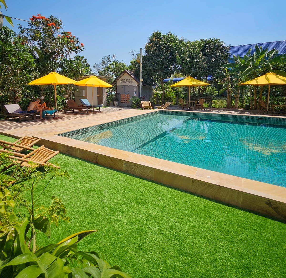 We offer 3-bedrooms villa with separate living room, dinning table, and large kitchen. Our guests will enjoy the free access to large pool 110 square meters, shallow water for kids, and deep water for adults to dive in. There's free use of playground, outdoor bbq table and facility. There's a free large, safe parking on the premise. our place is surrounded by big tree, garden, fruit trees and variety of birds. We also serve food and drinks starting from 7 am to 9pm.