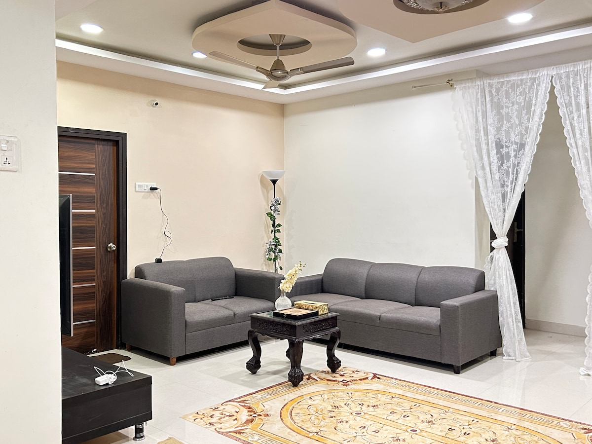 Welcome to your ideal home away from home. Our apartment is on the first floor of the villa without a lift, exclusively for the families only. Unmarried couples and Bachelors are restricted. Our apartment is spacious. A/C in both the bedrooms, with attached bathrooms. Featuring two spacious bedrooms, our retreat ensures a peaceful night's sleep . The master bedroom is with a king-size bed, while the second bedroom is with a queen-size bed, and two additional floor mattresses.