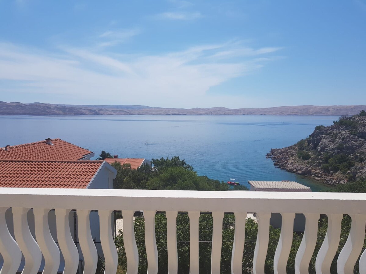 This is apartment on the first floor in our house: with kitchen, bedroom/living room and bathroom. It's 20 meters from the sea and beach. There are concrete, rocky and pebble beaches around, and we have our own beach! You’ll love my place: clean sea, beautiful view on Pag, green garden. It is great for couples, bikers and families. It has a variety of one day destinations to visit within 1 hour drive. Karlobag is the closest town, 4.5 km or 10 min away; Zadar is 1.5 hour, Senj is 1 hour from us.