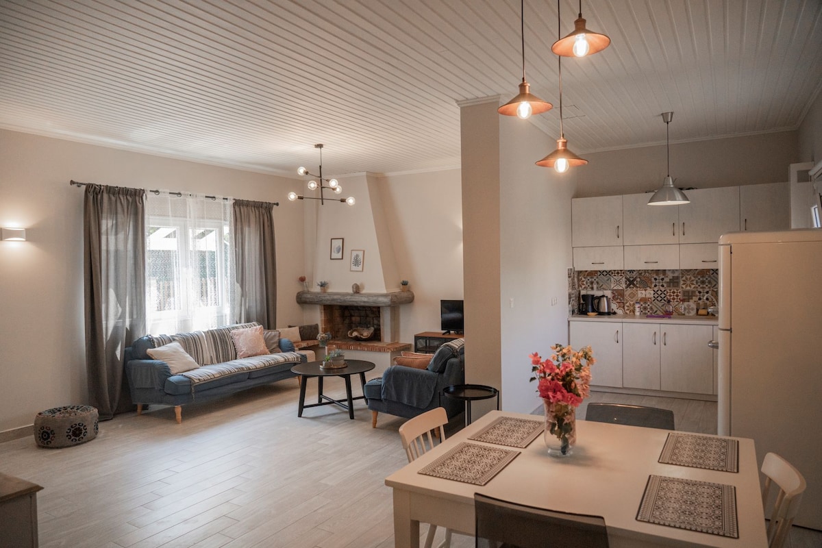 A small authentic cottage full of character, truly remarkable in every aspect, builded in 2017 has 1 bedroom, 1 bathroom and an open area where is the kitchen, dining table and the living room. It offers a romantic escape to couples that seek a peaceful brake, perfectly placed between coast and countryside for relaxation in harmony with the landscape, amid ancient olive grove and other fruit trees, 1' walk from Avlaki beach.